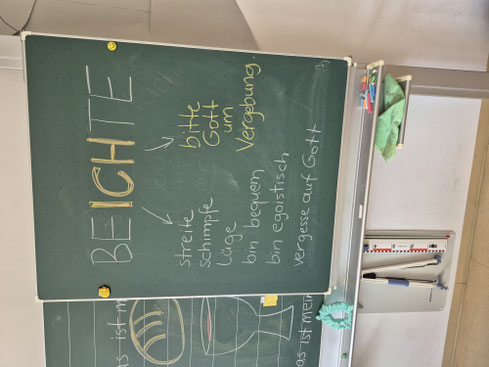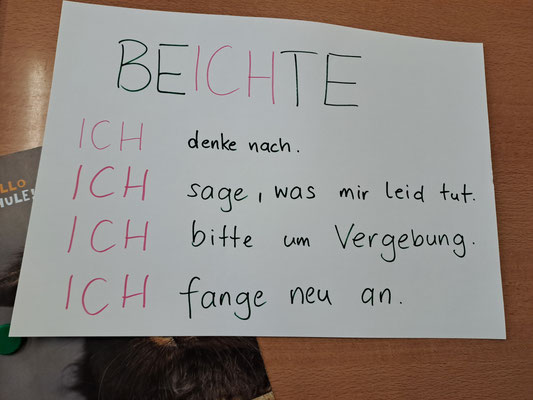 In der folgenden Stunde brachte ich viele bunte kleinen Füßchen mit. Die Kinder wählten drei aus und beschrifteten sie mit den Schritten zum Sakrament der Versöhnung: BESINNEN - BEREUEN - BEKENNEN - BEICHTEN - BETEN - BESSER MACHEN.